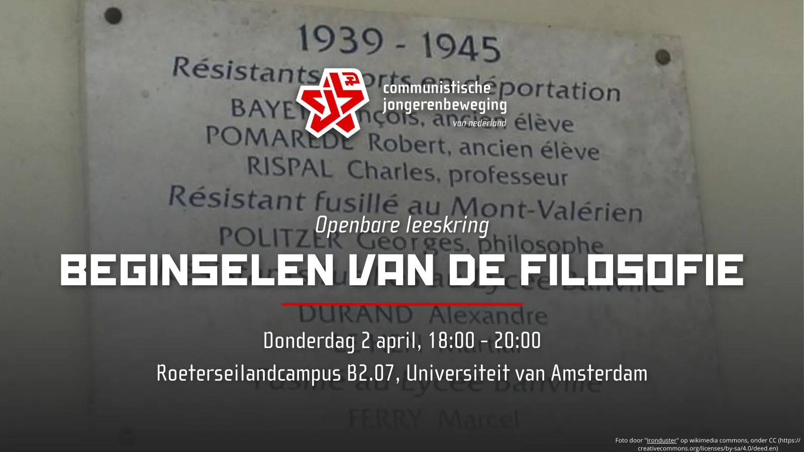 De Communistische Jongerenbeweging aan de Universiteit van Amsterdam organiseert op donderdag 2 april van 18:00 (deuren openen om 17:45) tot 20:00 uur deze leeskring over de Beginselen van de filosofie van Georges Politzer. De leeskring zal plaatsvinden in REC B2.07.