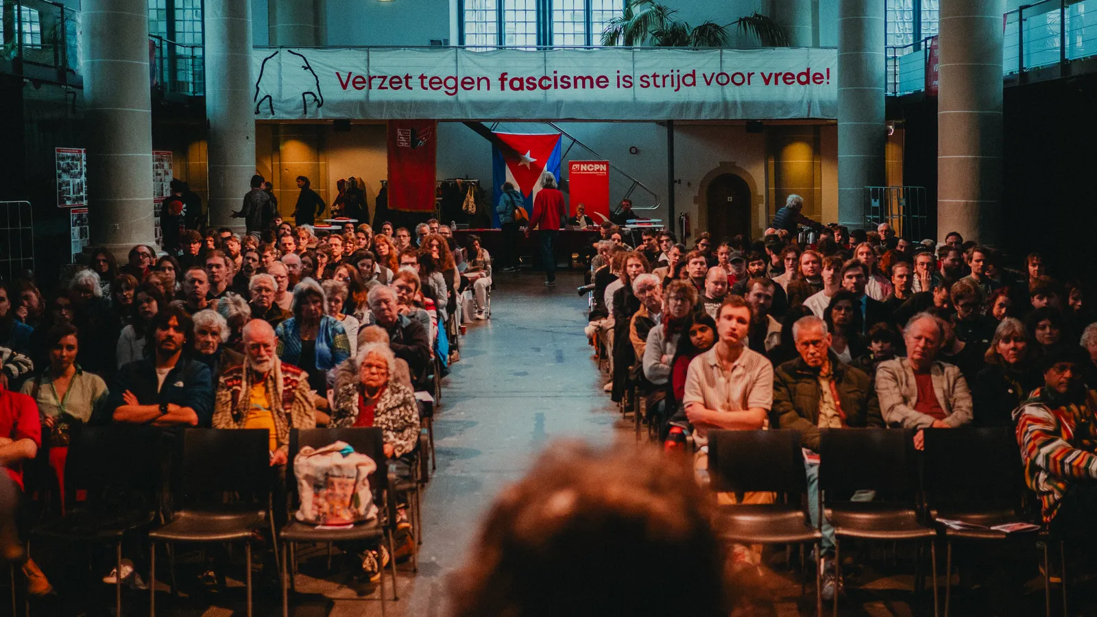 Het belang van zo’n klassenanalyse werd nog extra duidelijk gemaakt in de bijdrage van Alejandro de Mello namens de Commissie Antiracisme en Antifascisme van het Partijbestuur van de NCPN, die het antifascistische karakter van de Februaristaking benadrukte. Wanneer het kapitalisme in crisis vervalt en de winsten dalen, komen oorlog en fascisme om de hoek kijken als ‘oplossing’. Verdeel het volk en ze verliezen hun gedeelde klassenvijand uit het oog. En voer juist oorlog om de concurrentie uit te schakelen en opgehoopt kapitaal winstgevend te kunnen investeren. Alejandro lichtte dit principe toe aan de hand van het verhaal van Hendrikus Colijn: premier van 1933 tot 1939 namens de voorloper van het CDA. In zijn jongere jaren verantwoordelijk voor het slachten van inheemse vrouwen en kinderen als Tweede Luitenant in Indonesië, terwijl hij als bestuurder van Shell miljonair werd over de ruggen van diezelfde inheemse bevolking. Er volgde een schrijnende parallel tussen Colijn’s bewind en de huidige tijd van bezuinigings- en oorlogspolitiek.